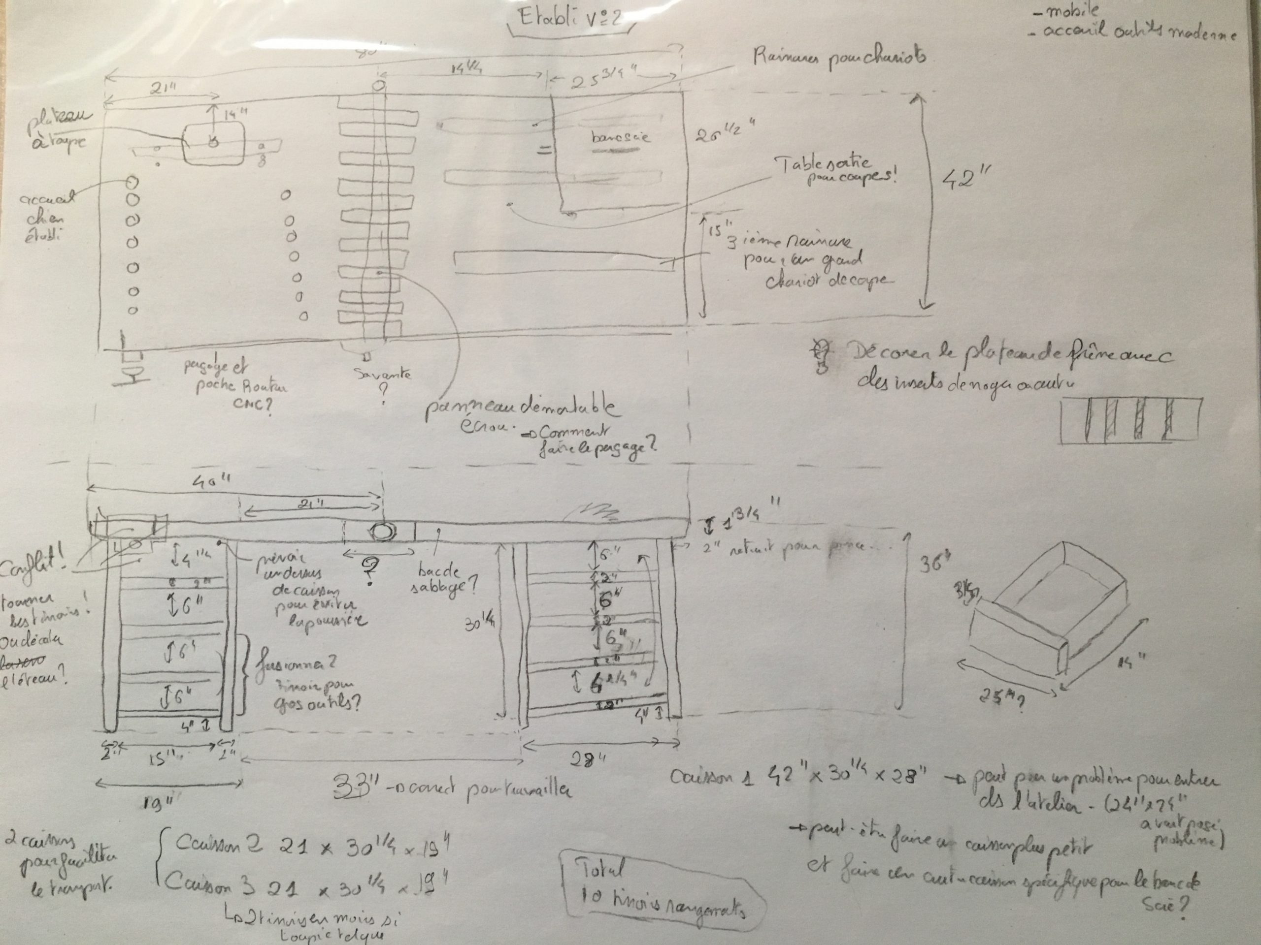 L’établi est un élément indispensable à quiconque veut travailler le bois. Il est souvent considéré comme le baptême du feu pour l’ébéniste qui démarre dans cette profession. J`ai donc décidé à mon tour de relever ce défi. Mes besoins sont différents des beaux établis qu’on peut trouver dans les revus de spécialisées dans le bois. J’ai réalisé un établi mobile, facile à démonter et à déplacer tout en gardant sa robustesse et son poids. Je me suis concentré sur l’intégration de mon banc de scie, un emplacement pour accueillir ma toupie sous table, mon étau trouvé dans la rue et la possibilité de ranger ma desserte.