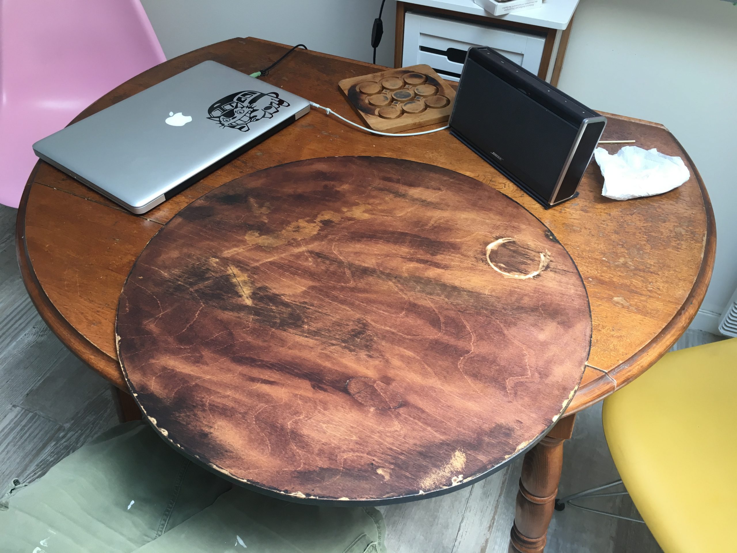 juillet 9, 2018août 12, 2021 Table bistro « Jupiter » Une de mes premières réalisations. J’ai trouvé ce rond en contreplaqué dans la rue avec cette tache, cette contamination à la colle sur le dessus. J’ai décidé de la réutiliser et de faire une table Jupiter.