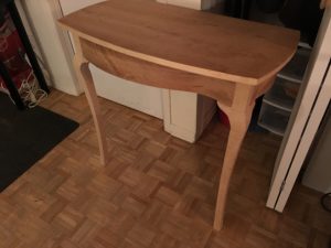 Pour les pattes (en merisier je pense) et les champs, j’ai opté pour une peinture blanche qui vient mettre du contraste avec le cerisier. Je n’étais pas très confiant de mélanger une finition « traditionnelle » avec de la peinture, mais je suis content du résultat final.